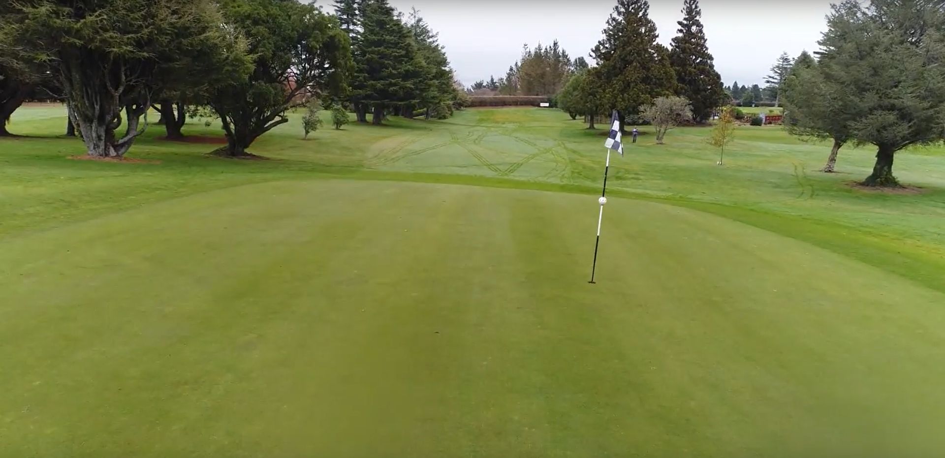 A short par 4, but not as easy as it might appear. Trees leading to a hazard guard the right side: even if a ball is in play on this side the approach to the green is blocked. A large tree and a grassy channel await a well hit drive left.